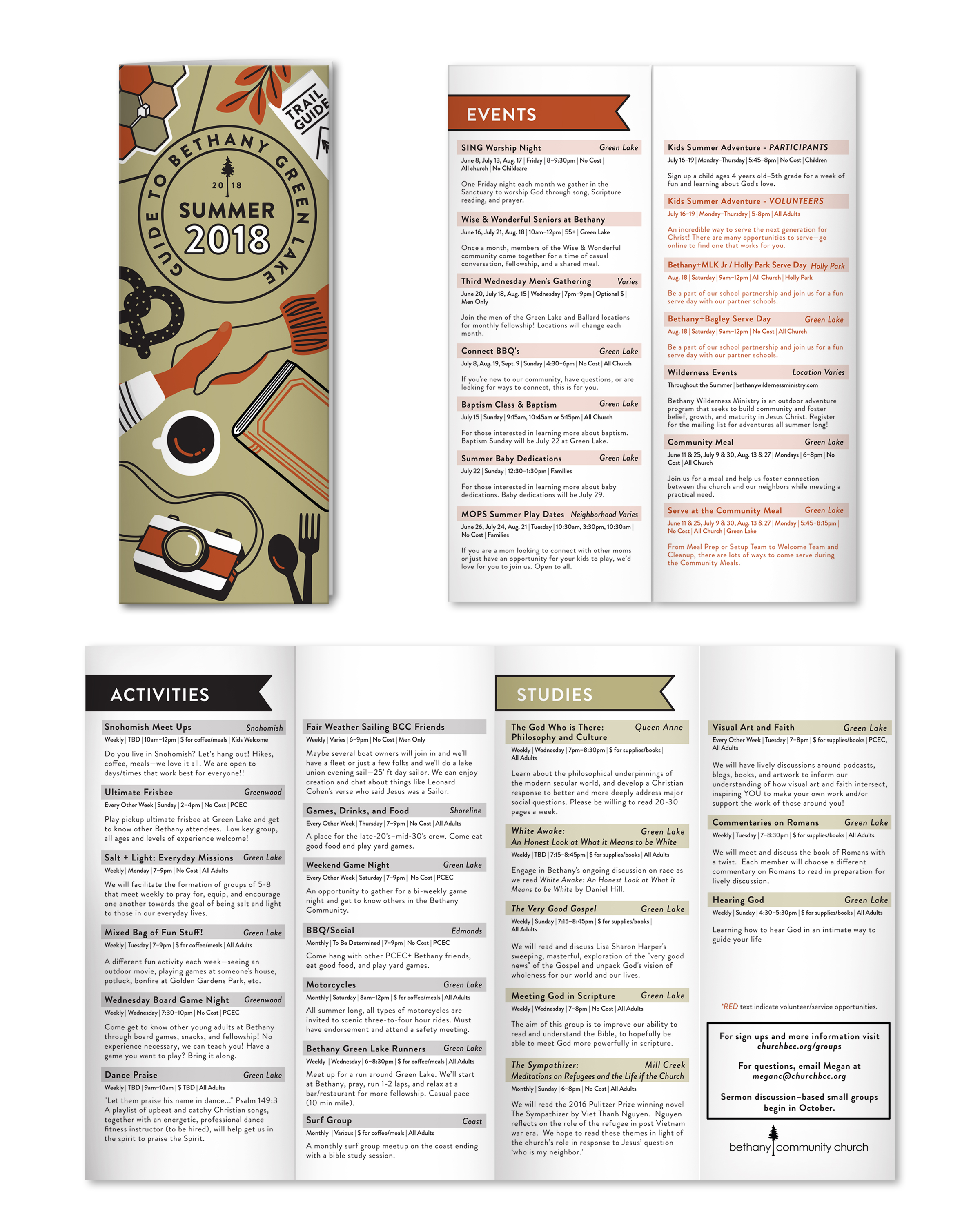 Summer Guide Brochure The Summer Guide brochure for Bethany Community Church was created to highlight summer events, promote and inform the Bethany brand, and give congregants a feel for the culture and community of the church.